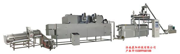 濕法生產(chǎn)線:拌粉機(jī)-螺旋輸送機(jī)-調(diào)制器-膨化機(jī)-烘干機(jī)-批次稱重式調(diào)味混合機(jī)