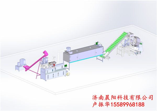 干法生產(chǎn)線:拌粉機(jī)-螺旋輸送機(jī)-膨化機(jī)-風(fēng)送機(jī)-烘干機(jī)-批次稱重式調(diào)味混合機(jī)
