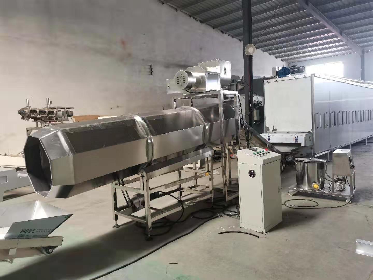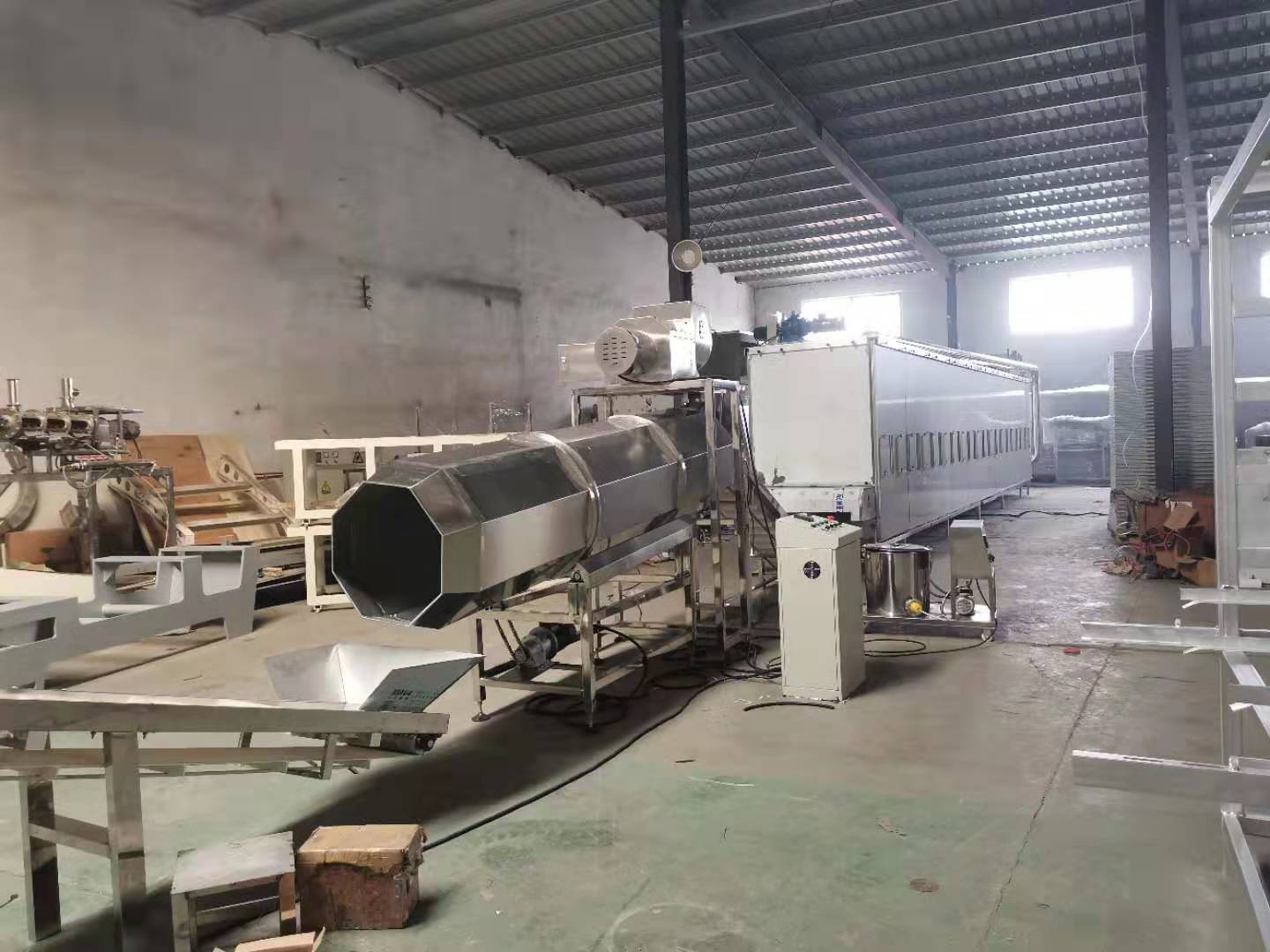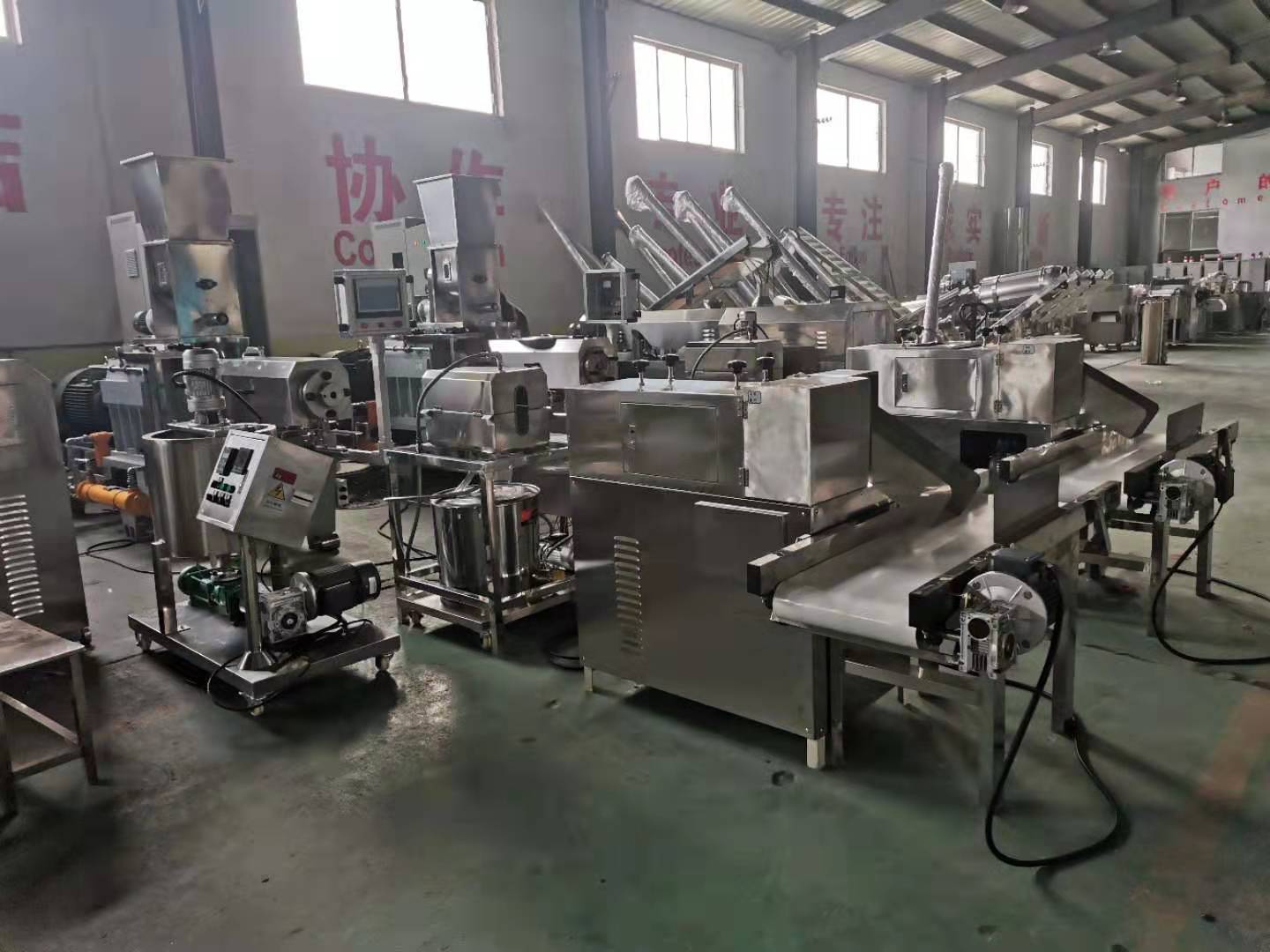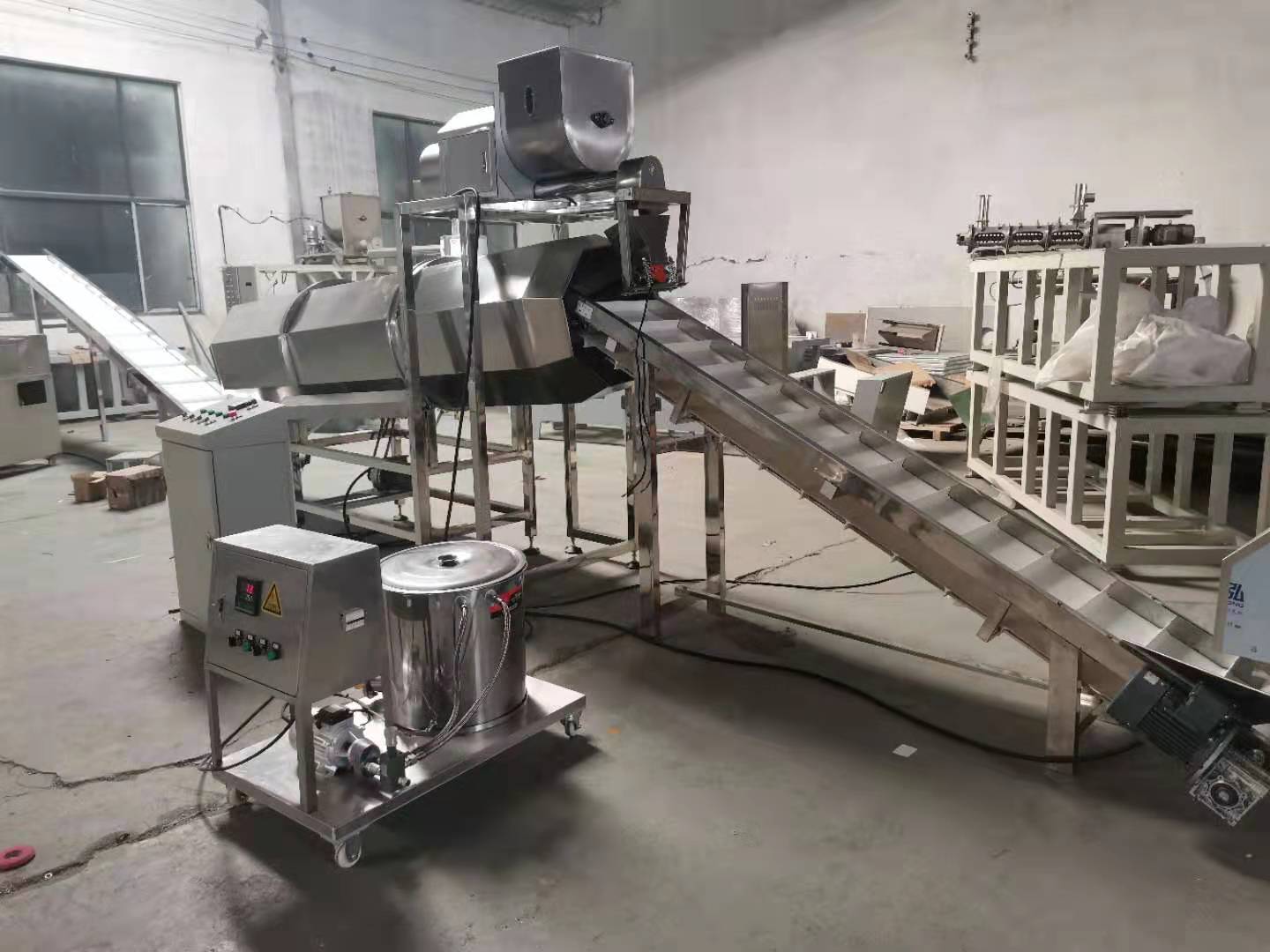 一、工藝流程: 原料配制拌粉輸送擠壓膨化注芯整形切斷輸送干燥噴油調(diào)味→(包裝)