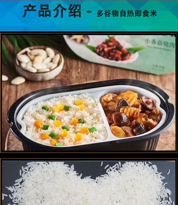開水沖泡型:如千石谷等,便于攜帶、儲藏,米粒香糯,五谷米飯種類多;細(xì)分可分為速煮米和纖維餐。脫水干燥型:經(jīng)過脫水干燥的米飯顆粒,在食用時覆水(加開水浸泡)數(shù)分鐘即可食用,分自熱型如廚師、得益;