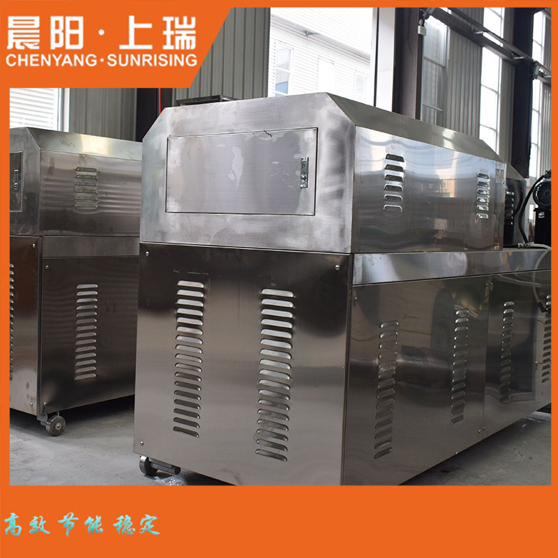 反向旋轉(zhuǎn)雙螺桿擠壓膨化機(jī)一般采用兩根尺寸完全相同,但螺紋方向相反的螺桿。向內(nèi)旋轉(zhuǎn)和向外旋轉(zhuǎn)的區(qū)別在于壓力區(qū)的位置不同,雙螺桿向內(nèi)旋轉(zhuǎn)產(chǎn)生的壓力為上高下低,物料通過(guò)雙螺桿時(shí),在入口會(huì)產(chǎn)生極高的壓力,造成進(jìn)料困難,這種向內(nèi)反向旋轉(zhuǎn)式很少采用;雙螺桿向外旋轉(zhuǎn)產(chǎn)生的壓力為上低下高,有利于進(jìn)料。但反向旋轉(zhuǎn)與同向旋轉(zhuǎn)相比,物料在螺桿內(nèi)形成的C形物料流不能從一根螺桿移向另一根螺桿,物料產(chǎn)生的混合程度顯著降低,其自潔能力也沒(méi)有同向旋轉(zhuǎn)雙螺桿有效和穩(wěn)定。