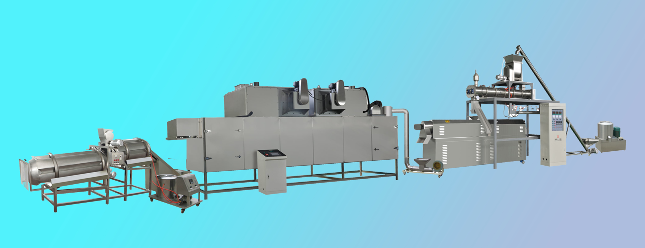 自動生產線工藝從、粉碎、混合、膨化、烘干、噴涂、冷卻、包裝流水線運行,