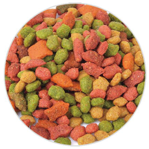 工藝方面寵物食品生產(chǎn)技術(shù)可將客戶的配方的體現(xiàn)在產(chǎn)品的形狀、大小、適口性、膨化度以及水分含量等,并可按照客戶要求著色、噴油、噴漿、噴粉以及成品自動(dòng)混色(料)。