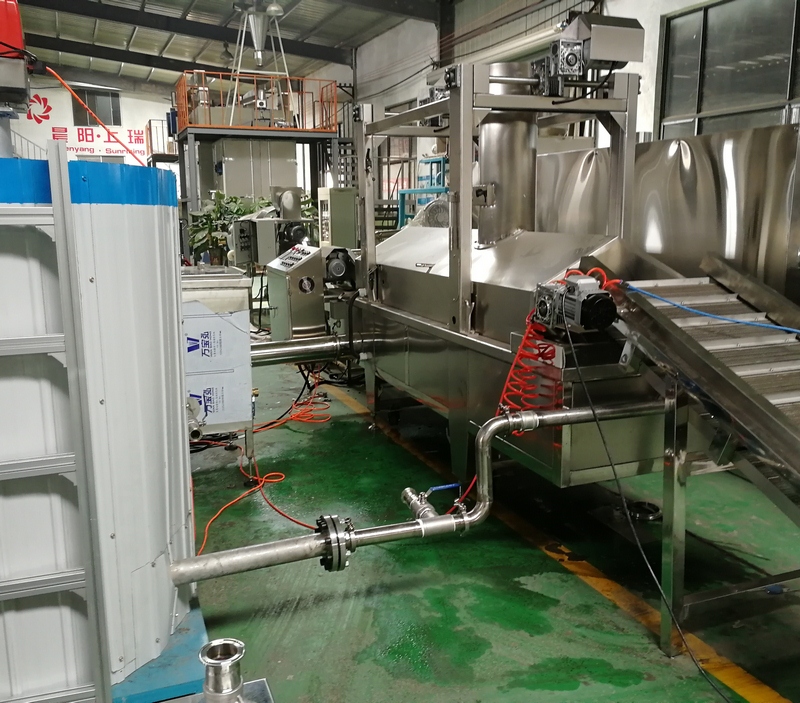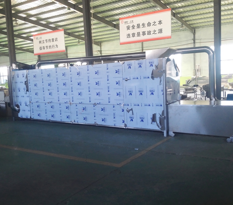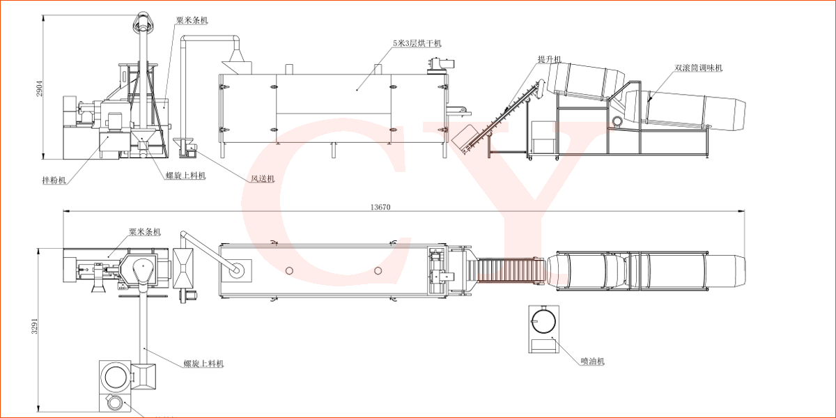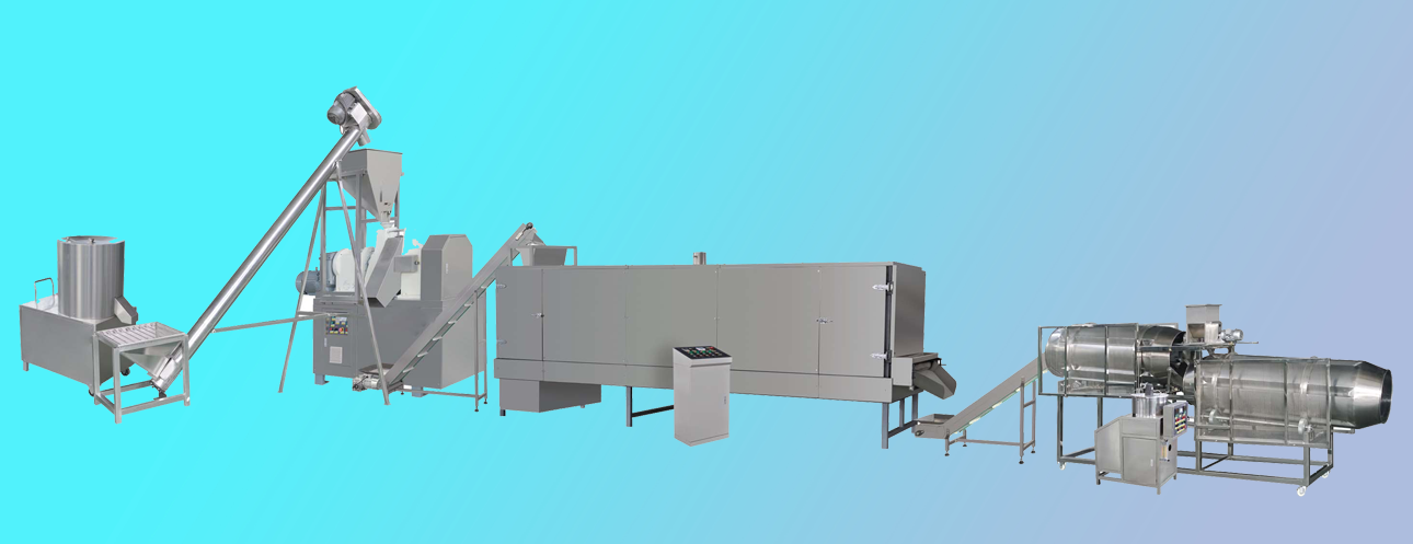拌粉機(jī)→膨化機(jī)→提升機(jī)-一滾篩-提升機(jī)-連續(xù)油炸機(jī)-振動(dòng)脫油機(jī)--單滾筒調(diào)味機(jī)-調(diào)味機(jī)