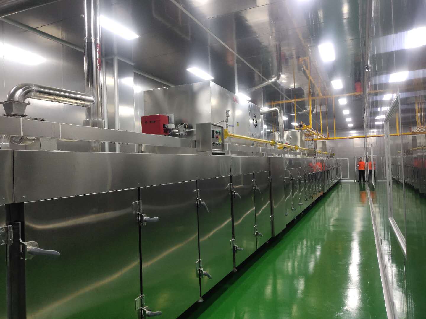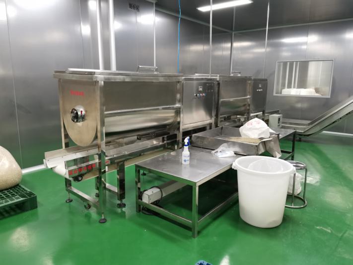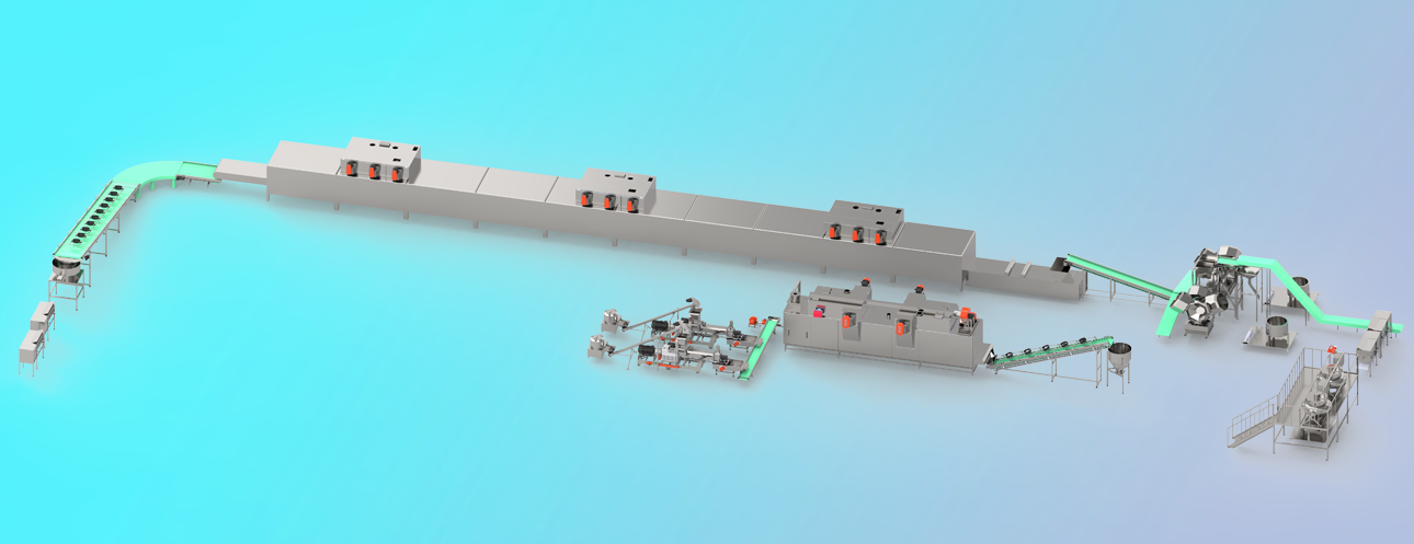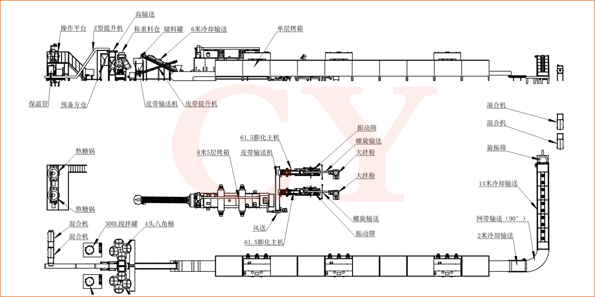 拌粉機→螺旋提料機→膨化主機→提升機→五層烘干機→冷卻機→混合機→熬糖設(shè)備→噴糖設(shè)備→提升機→單層高溫烘干機→冷卻機→振動篩